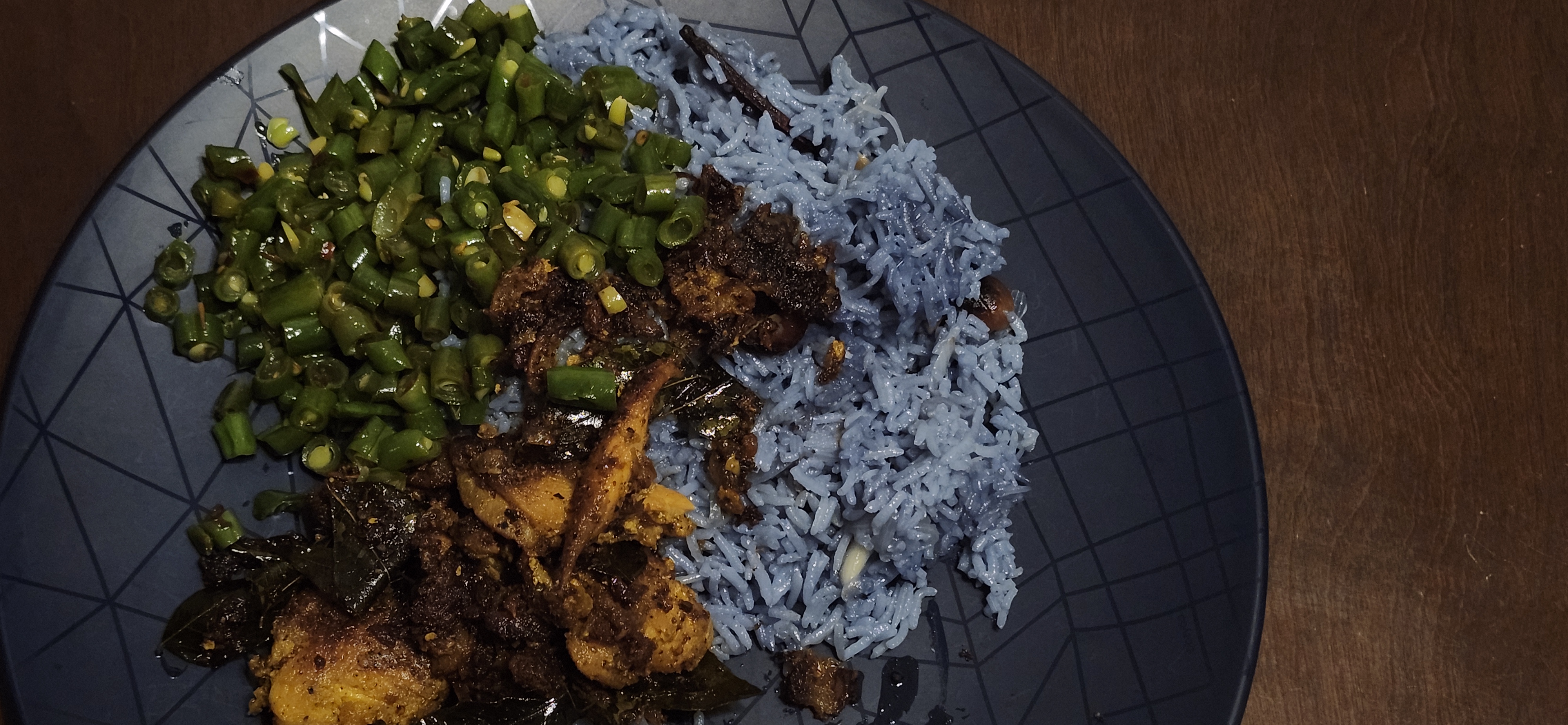 Rice cooked in peaflower extract and coconut milk with beans and fried fish